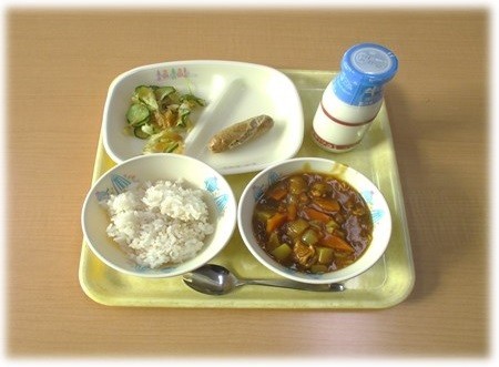 今日の献立は、麦ごはん、牛乳、ポークカレー、焼きフランクフルト、福神漬和えです。
