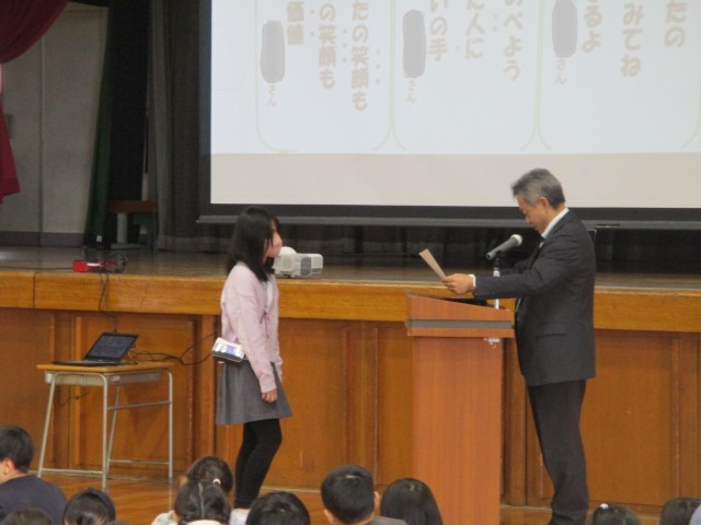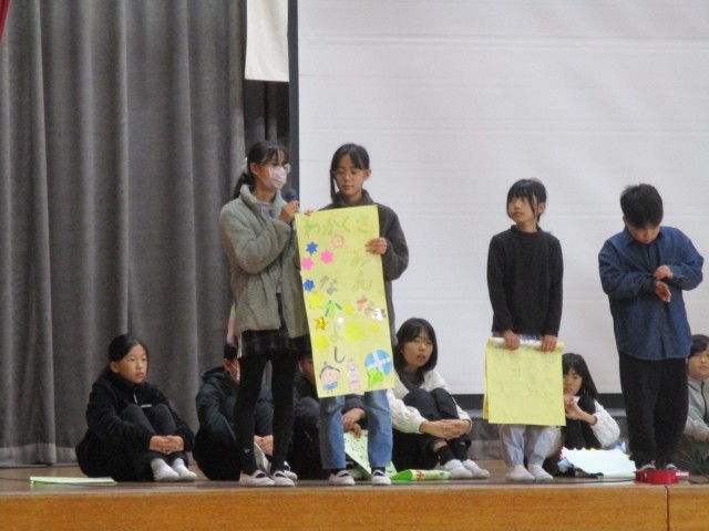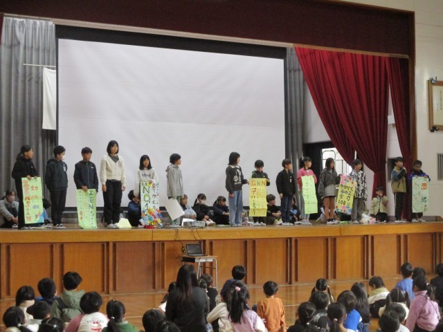 児童会からのクイズや、各クラスの学級目標の振り返りを通して、周りの人にやさしく接しようとする気持ちを高めました。また、会の最後に、人権標語の表彰も行いました。選ばれた標語は廊下に掲示しますので、ぜひご覧ください。