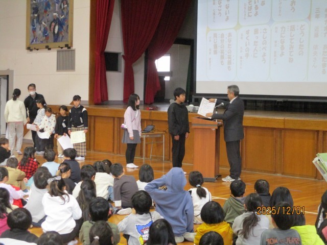 人権集会では、学級目標の反省と人権標語の表彰がありました。