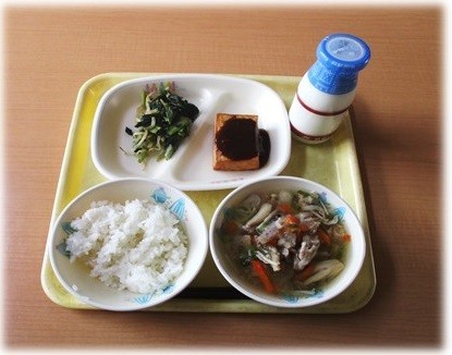 今日の献立は、ごはん、牛乳、絹厚揚げの肉みそがけ、小松菜のおひたし、みぞれ汁です。