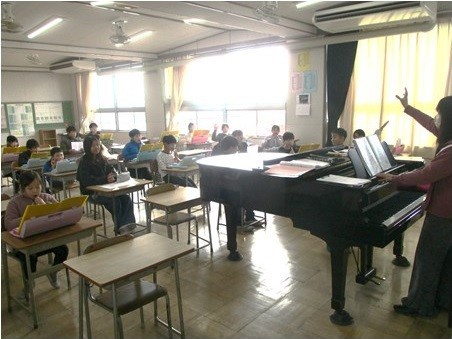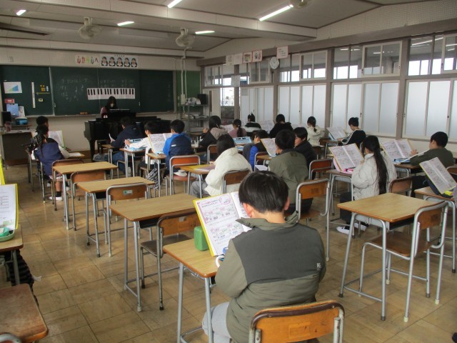 音楽では「ラ・クンパルシータ」を学習しています。範奏を聴いて曲想やタンゴのリズムをつかみ、鍵盤ハーモニカで楽しく演奏していました。