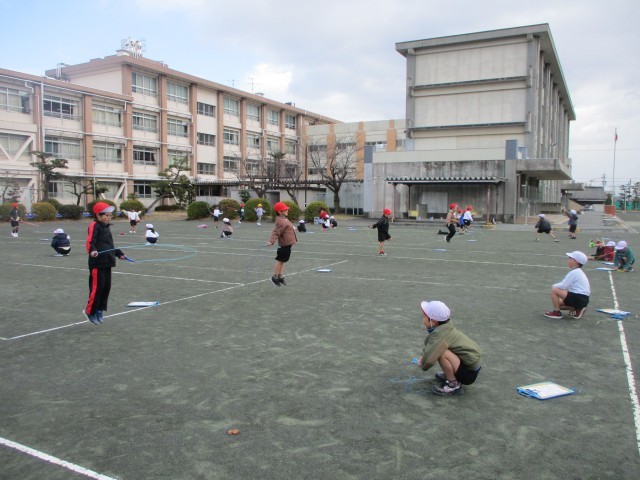 寒さに負けず、みんな頑張って練習しています。両足とび、左右開閉とび、前後開閉とび・・・リズムに合わせて跳ぶと楽しいね♪
