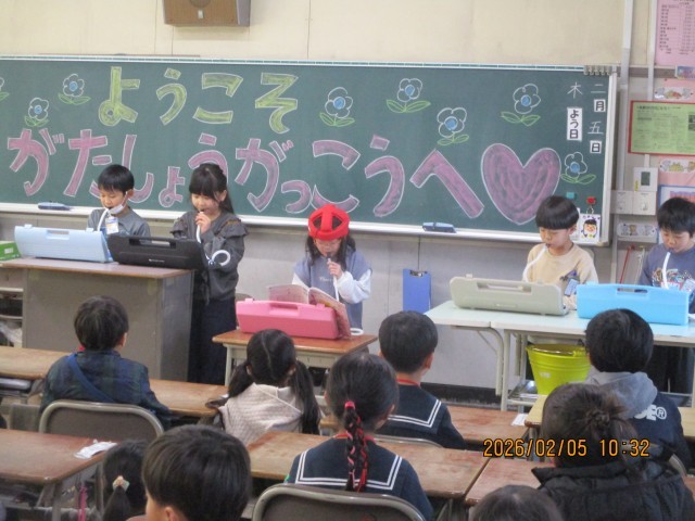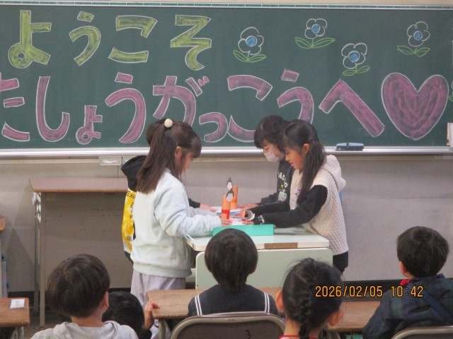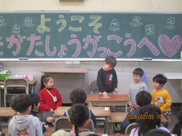 年長の子供たちに学校の楽しいところを伝えたり、とんとん相撲を作って一緒に遊んだりしました。