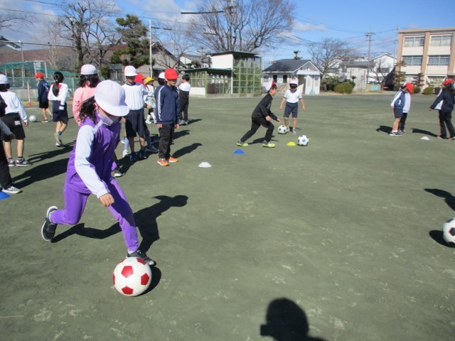体育の授業で、「ボールけりあそび」に取り組んでいます。足でボールを運んだり、相手にパスをしたりと楽しみながら運動しています。