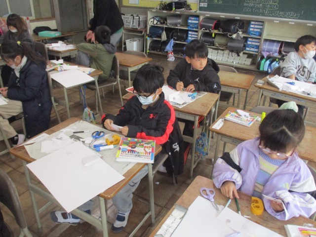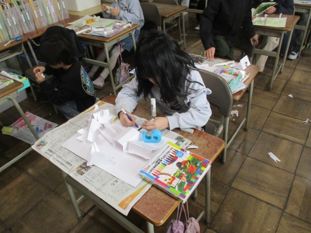 図工で「おってたてたら」という教材で作品作りをしました。いろいろな折り方を試しながら、画用紙の上にどのように立たせるのかを工夫しながら作品を作りました。楽しく作ることができました。