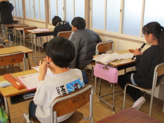 今日は「冬げしき」のテストでした。先生の前で歌を歌いながら指揮を振り、リコーダーを演奏しました。指づかいを練習しながら順番を待つ子、全員のテストが終わるまで静かにプリントに取り組む子など、待ち方も高学年らしくて立派ですね。