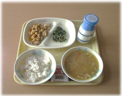 今日の献立は、そぼろ丼(麦ごはん、具)、牛乳、ほうれんそうのおひたし、呉汁、ココアパウダーです。