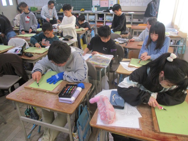 図工では、彫刻刀を使って作品を作りました。彫刻刀の使い方に気を付けて、行うことができていました。