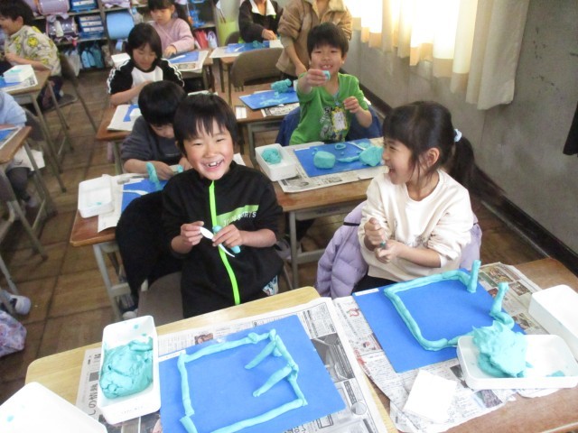 今日、図工で粘土遊びをしました。自分の住みたい家や自分が行ってみたい場所をテーマに楽しく作品を作ることができました。