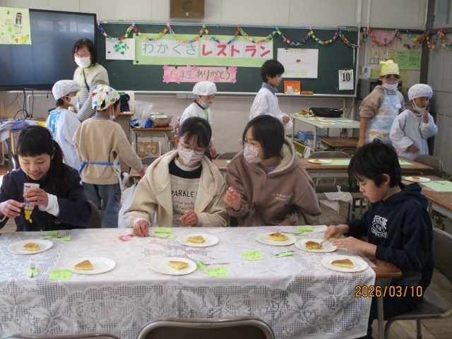 1~4年の子たちが「わかくさレストラン」を開き、6年生にこれまでの感謝の気持ちを込めて、ホットプレートでパンケーキを焼きました。6年生を招待して、みんなでおいしく会食をしました。6年生と一緒にすごせるのも、あとわずかになりました。
