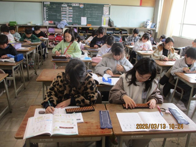 3年生のまとめの1週間。社会では、粘土を使って、未来の一宮市をつくりました。書写では、がんばった自分の表彰状を書いて、1年間の作品の表紙に貼りました。算数ではそろばんの学習をしました。数の置き方やはじき方など基本的なことを覚えました。集中して取り組みました。