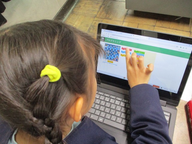 算数でプログラミングの学習をしました。ロケットが目的地へ着くように、指令を工夫して動かしました。みんな楽しんで取り組んでいました。