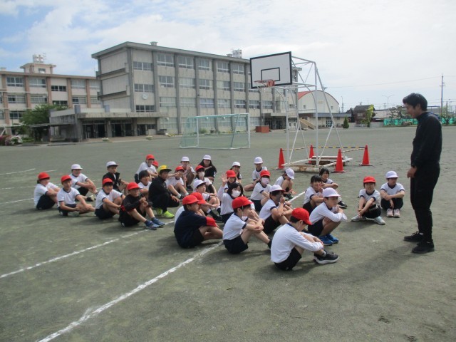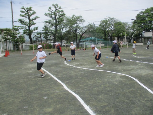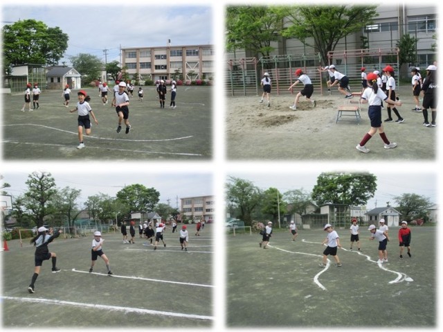 運動場では、5年生が体育で幅跳びの学習です。今日は、川跳びや片足で跳ぶ練習をしました。助走をつけて、走り幅跳びへと発展していきます。