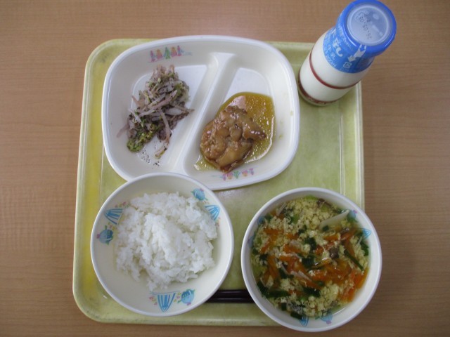 今日の献立は、ごはん、牛乳、てりどり、はくさいの赤じそ和え、かきたま汁です。