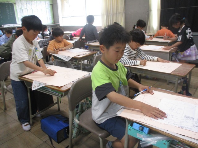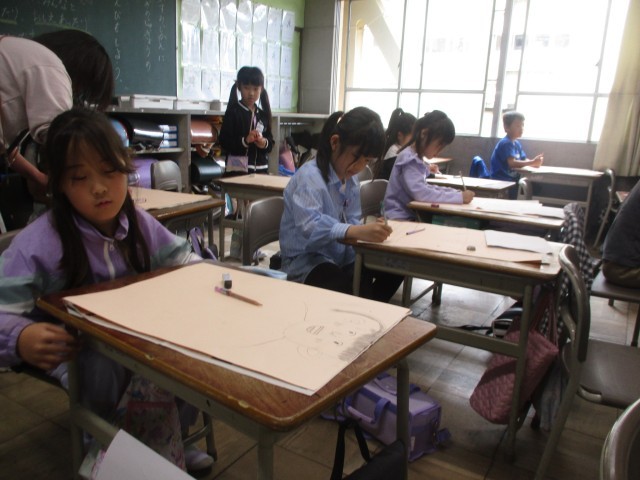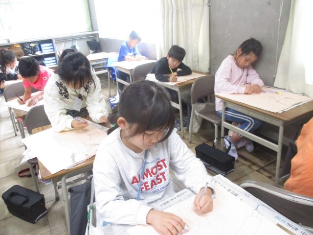 図工の授業の様子です。学校であった「たのしかったこと」や「ドキドキしたこと」を画用紙に描いています。完成が楽しみですね。