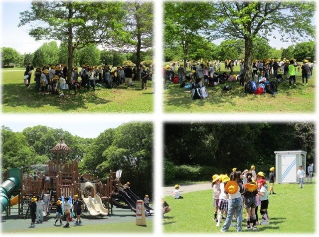 みんな元気に目的地に到着しました。ペアでのゲームや遊具遊び、ウォークラリーなど、元気に楽しんでいます。そろそろおなかがすいてきたかな。