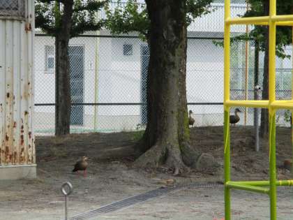 誰もいない校庭で「グワッ、グワッ」と聞きなれない鳴き声がしたと思ったら、3話のカルガモが上空からかっこよく飛んできました。体育倉庫の横で一休みをした後は、すぐさま飛び去ってしまいましたが、ちょっとびっくりしました。