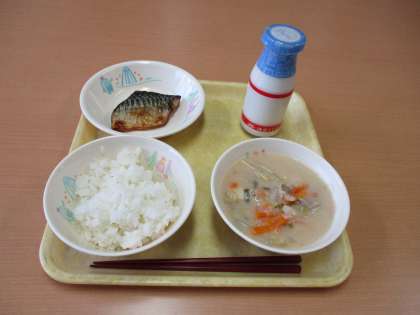 今日の献立は、ご飯、牛乳、豆乳みそ汁、さばの塩焼きです。