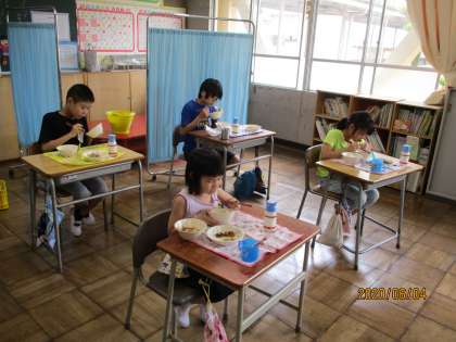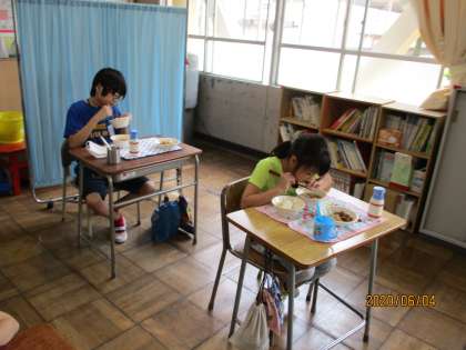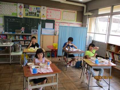 毎日おいしい給食を食べています。ソーシャルディスタンスを保ちながら、みんな落ち着いて楽しい給食の時間を過ごしています。