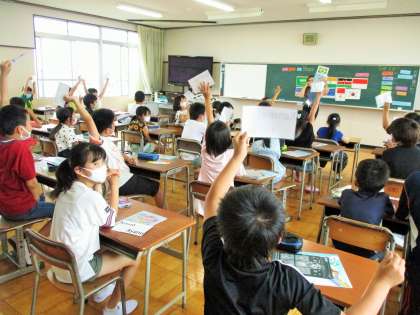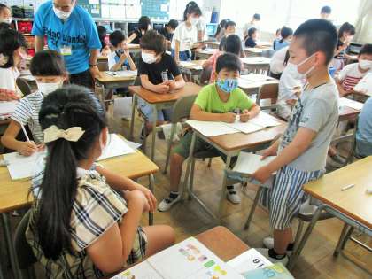 昨日の授業の様子です。英語の授業では、先週はALTの先生から世界のいろいろな国の挨拶を学び、今週は教室で友達と挨拶をして、自分の好みなどを伝え合いました。大人数で会話をしないように、一人ずつ全体に挨拶をしたので、クラスのみんなの好みも知ることができて楽しかったですね。