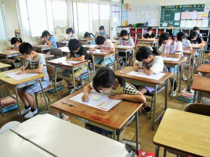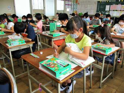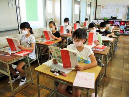 国語の授業では、全員で音読ができないので、黙読をしています。良い姿勢で、集中して物語を読む姿が立派です。