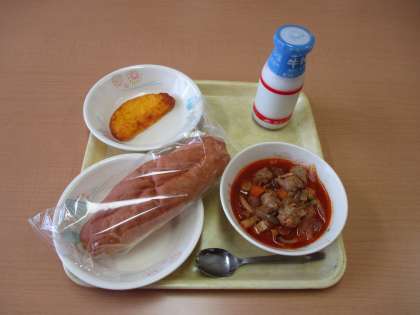 今日の献立は、米粉パン、牛乳、ミートボールの完熟トマト煮、オムレツです。