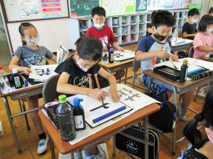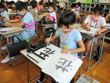 よい姿勢・よい持ち方で、筆使いや文字の大きさに気をつけて「花」を練習しました。来週は、字形を整えて、きれいな字で清書しましょうね。