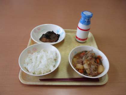 今日の献立は、ご飯、牛乳、新じゃがのそぼろ煮、あじのしろしょうゆ焼きです。