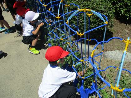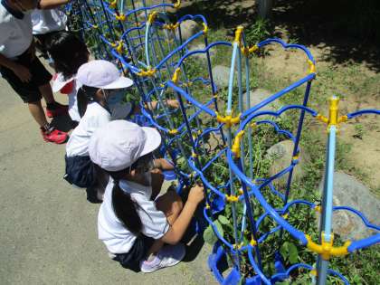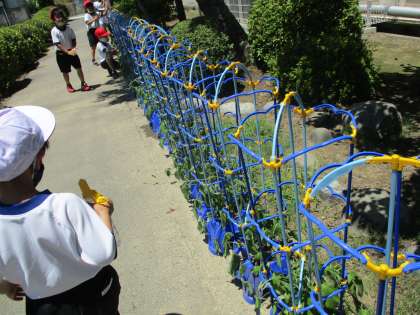 先日は水やりをしていると、「うわぁ!ジャックと豆の木みたい。」「ぐにゃぐにゃ〜。」と、長いつるにびっくり!