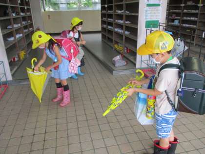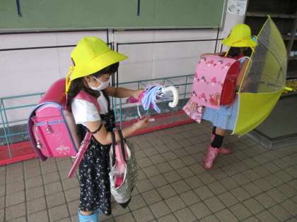 今日は雨の中の登校でした。昇降口についた子どもたちは、傘についた水を切って閉じ、靴をマットで拭ってから自分の靴箱へ向かっていました。マナーがしっかり身についています。