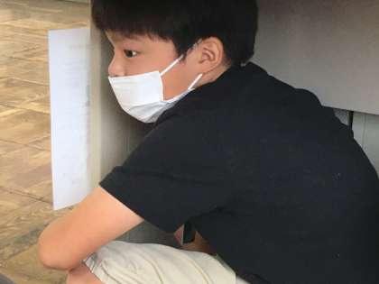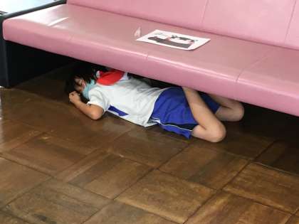 3時間目の授業中にミニ避難訓練を行いました。保健室にいた2人はすぐに放送を聞いて目を合わせ、先生の目を見て、次に机やソファーの下に潜り込みました。机の脚をしっかり持ち自分の身を守ることができました。