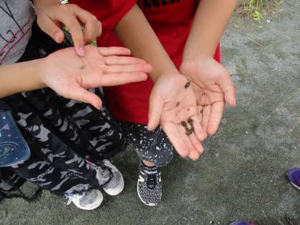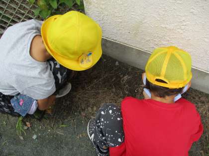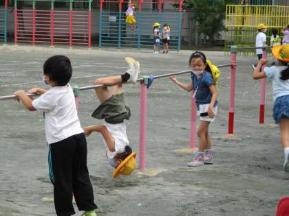 今日は運動場が使えました。みんな外へ出て、バッタやダンゴムシを捕まえたり、鉄棒をしたりして遊びました。久しぶりに運動場で遊ぶことができ、とても楽しそうでした。