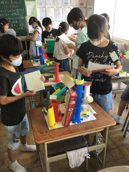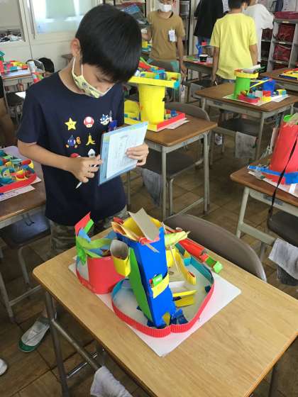 コロコロガーレが完成し、鑑賞会を行いました。授業以外にも、休み時間にも熱中して作っていた子どもたち。どの子も、見ごたえのある、楽しい作品ができました。