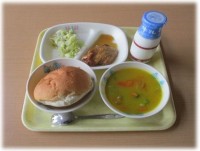 今日の豆乳みそ汁は、豆乳が入った白みそベースのみそ汁です。みそ汁などに使うみその種類は、地域や家庭によって違います。給食では白みその他に、ミックスみそや、この地方でよく使われる赤みそを使用しています。