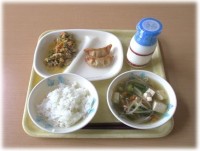 今日の献立は、麦ご飯、牛乳、カレーシチュー、ヒレカツ、いろどりサラダです。