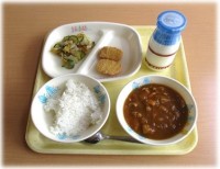 今日の献立は、わかめご飯、牛乳、肉じゃが、いわしの梅煮です。