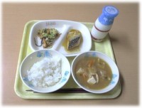 今日の献立は、ご飯、牛乳、ちゃんこ汁、絹厚揚げの甘みそがけ、小魚です。