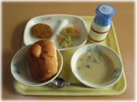 今日の献立は、ご飯、牛乳、牛肉と糸こんにゃくのいり煮、野菜かき揚げです。