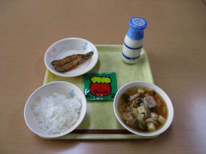 今日の献立は、ご飯、牛乳、いわしのかば焼き風、節分のすまし汁、いり大豆です。
