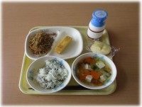 今日の献立は、ごはん、牛乳、絹厚揚げのそぼろあんかけ、肉じゃがです。