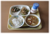 今日の献立は、ごはん、牛乳、豚肉と大根の甘辛煮、キャベツ入りつくね、にんじんシリシリです。