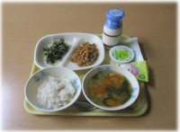 今日の献立は、麦ごはん、牛乳、お豆の...