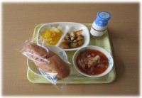 今日の献立は、小麦入り米粉ロールパン、牛乳、じゃがいもとウインナーのコンソメいた...