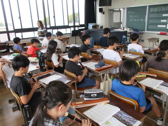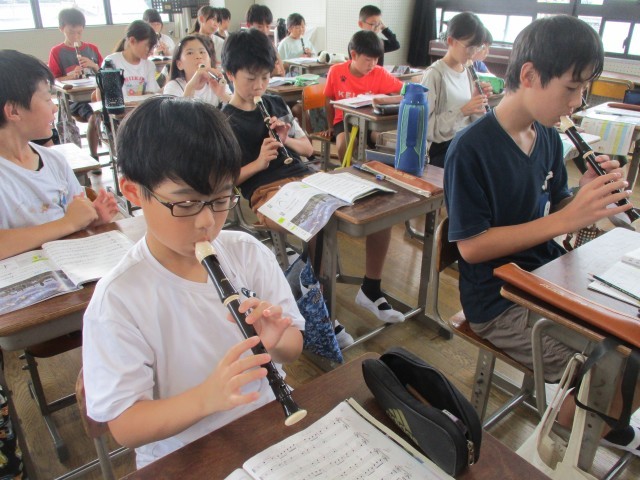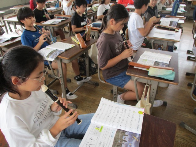 「星笛」のCDを聞き、リコーダー演奏の練習をしました。かけ合いや重なりを生かした演奏を学んでいきます。