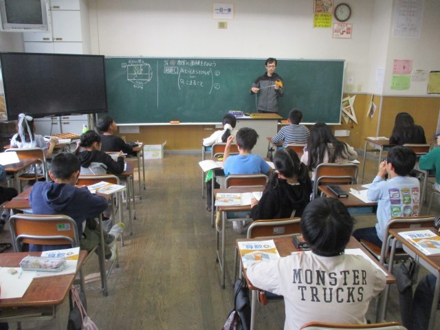 教室の面積を調べるにはどのようにすればよいかについて、みんなで考えていきました。