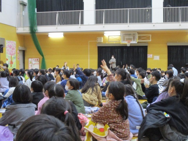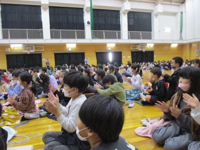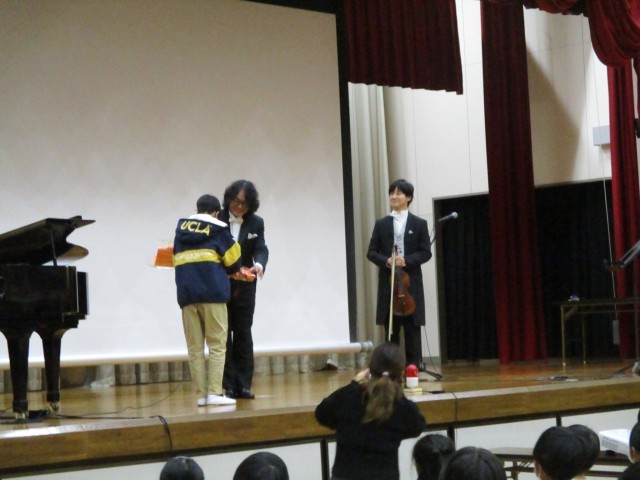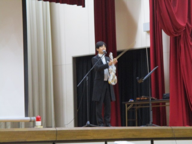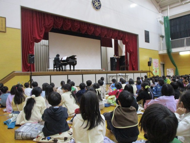 今日は芸術鑑賞会がありました。株式会社プラスギスのスギテツさんたちが来てくれて、ピアノとバイオリンの演奏やいろんな音を聞かせてくださいました。