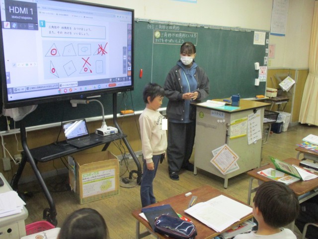 三角形、四角形はそれぞれどんな図形なのか、それぞれの特長を考えました。