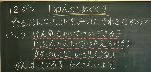あっという間に12月です。教室の背面黒板には「1年のしめくくりをしよう」と書かれていました。