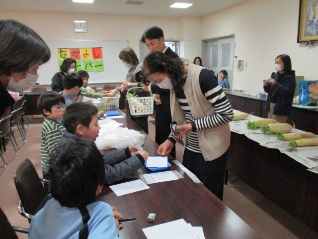先週の木曜日に、学年園で育てた大根とさつまいもを先生方に販売する活動を行いました。活動前に立てた目標、「えがおで 大きな声で ていねいに ゆっくり 目を見て」接客することを目指してがんばりました。元気よく「いらっしゃいませ」を言ってかごを渡したり、お釣りを間違えないように計算したり、品物をていねいに袋につめたり、空いたかごを片付けたり、それぞれが自分の仕事をしっかりとできました。