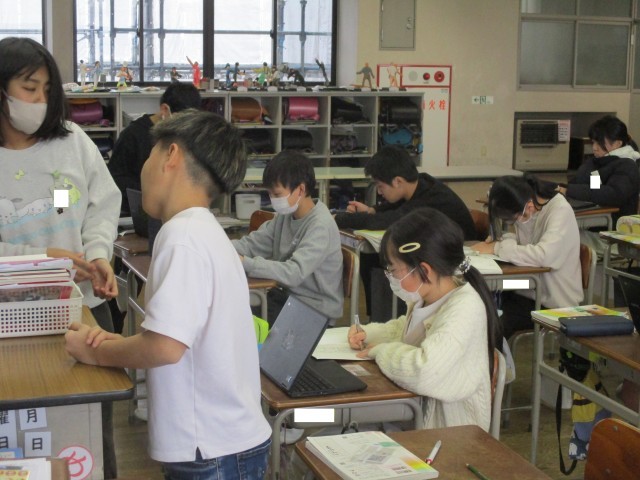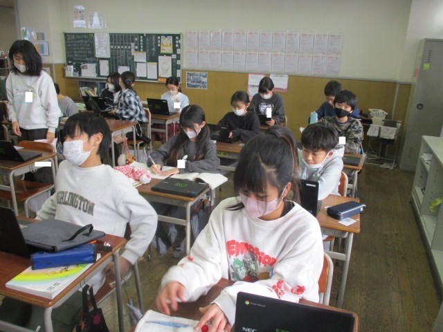教材にある三つの文章を読んで自分の考えを持ち、その考えを文型に則って表していきました。